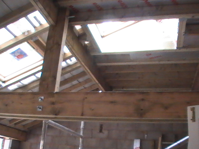 The Upvc bi-fold doors and patio doors lead into a unique living space. The existing kitchen wall was also removed. A traditionally cut roof was designed to create a vaulted ceiling incorporating exposed large timber beams and posts. To achieve the correct roof pitch, flat roofs were used in front of the windows. Velux roof lights added high level natural light. A new kitchen was fitted to compliment the living space.